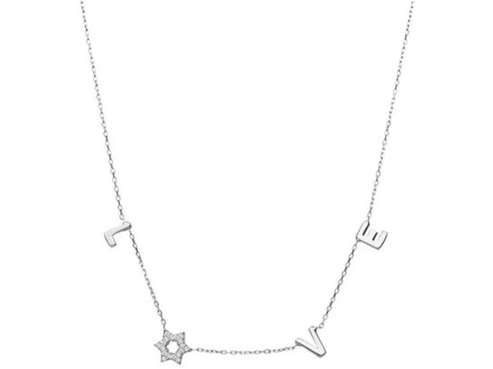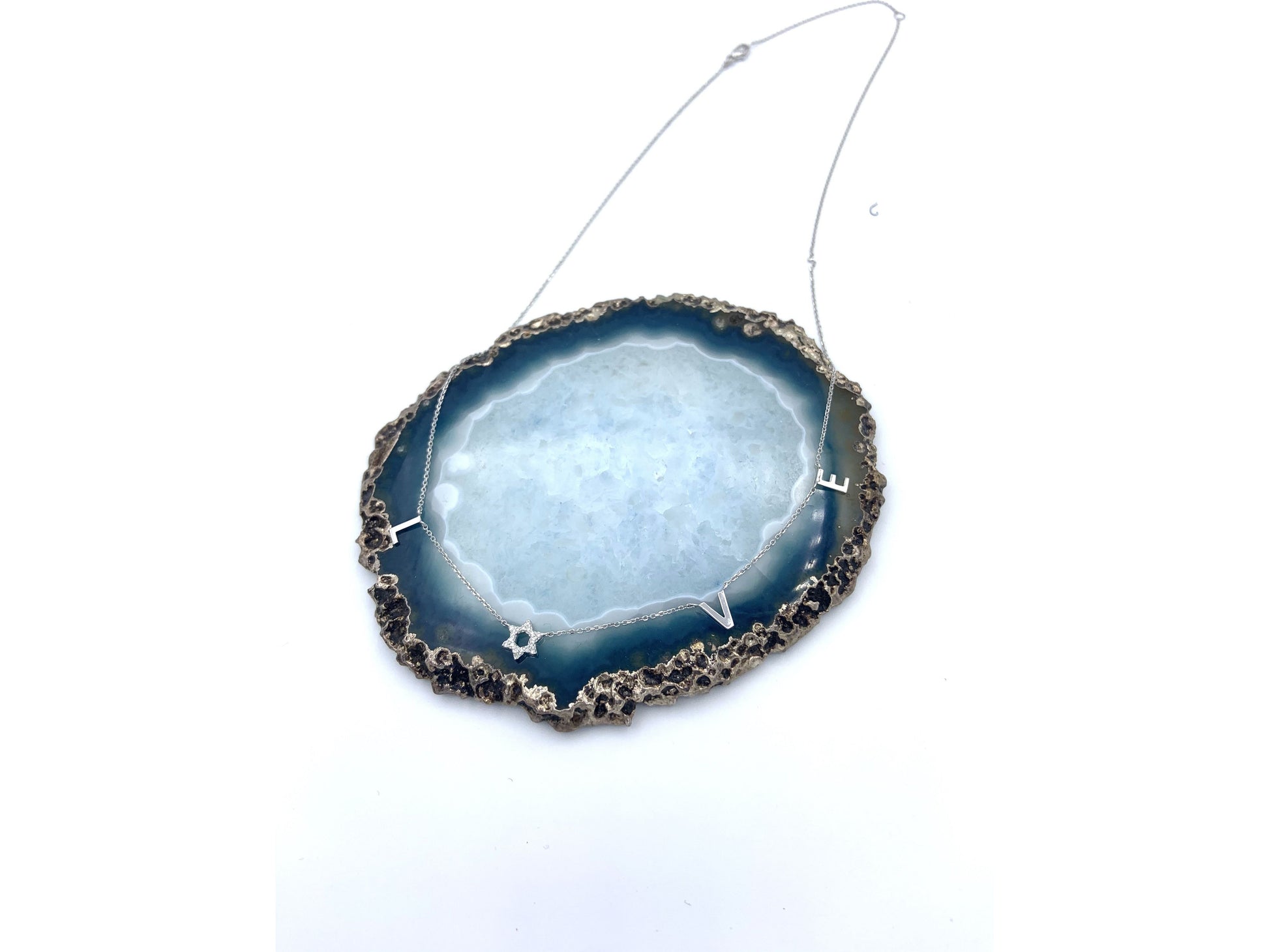 This beautiful LOVE Necklace with Star of David as the "O", in 14k Gold and Diamonds (0.06ct)