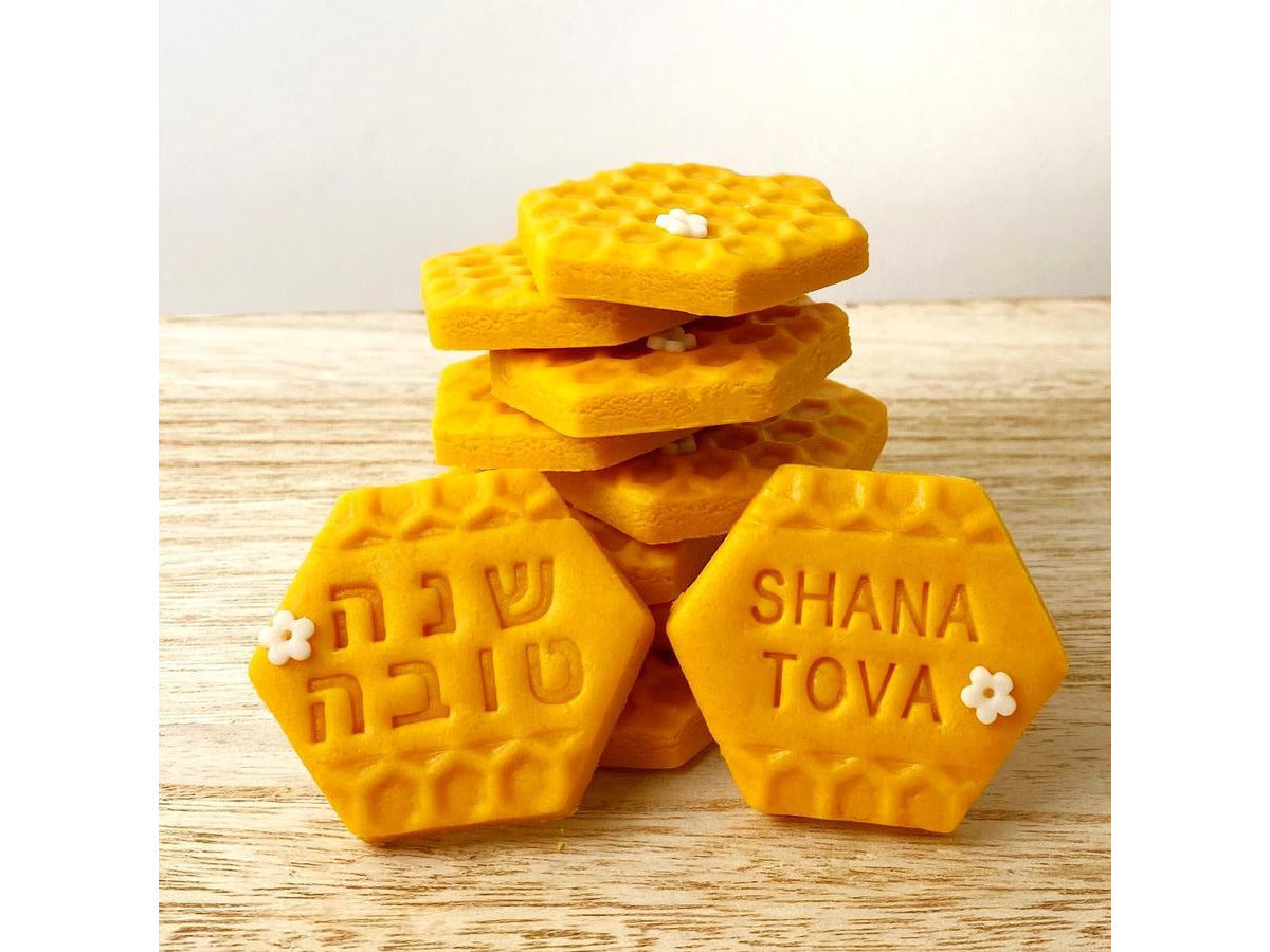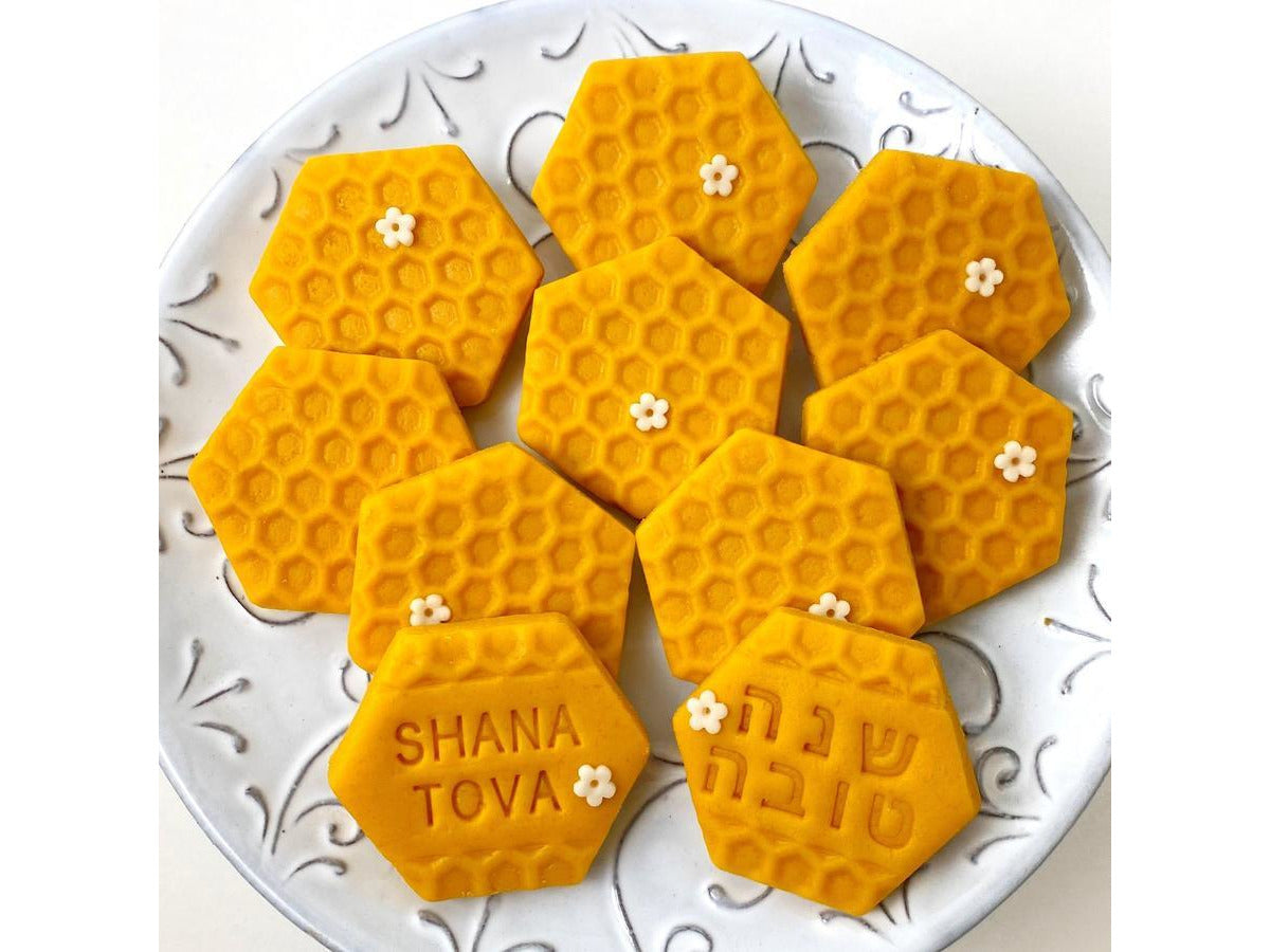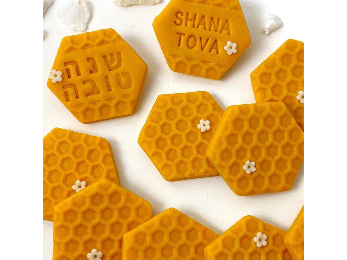 Why send a plain greeting card when you can send an edible Shana Tova? Decorated with honeycomb embossing, delicate apple blossoms and Shana Tova greetings in both Hebrew and English, these stunning larger tiles are hand made in a beautiful shade of honey-colored marzipan. ! שנה טובה