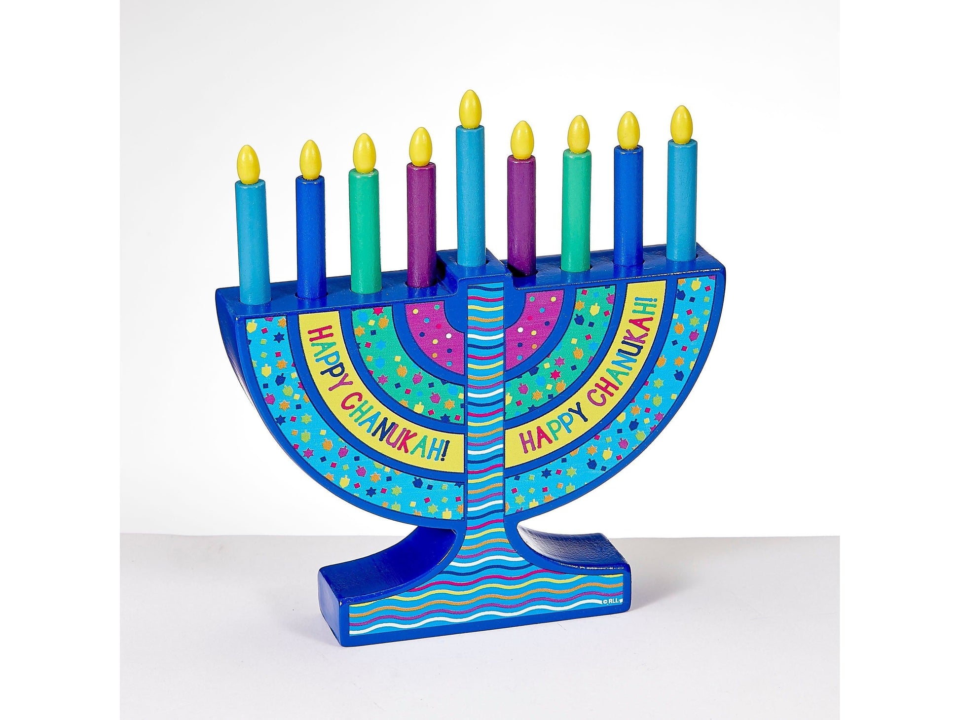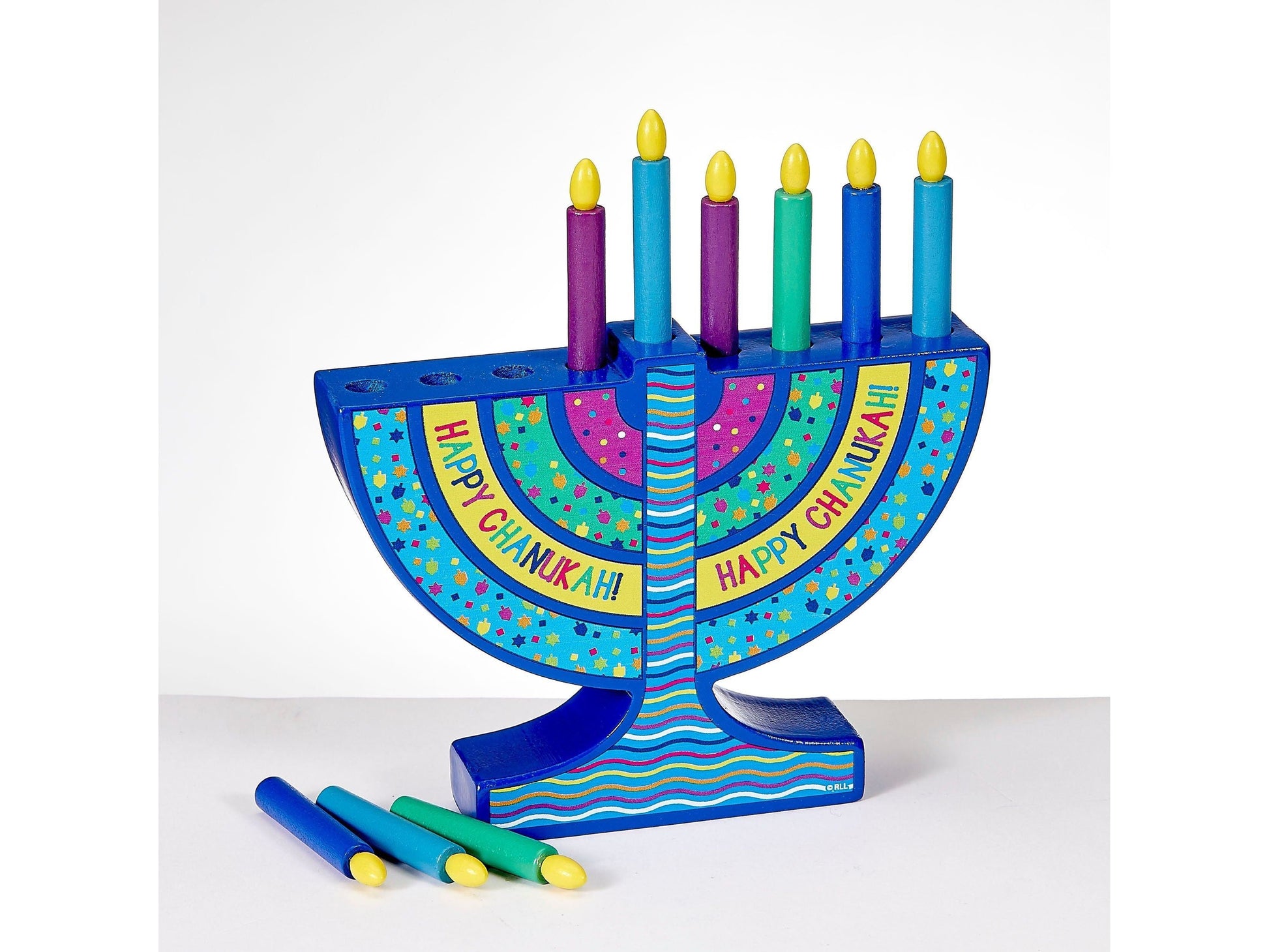 Brighten up the Chanukah celebration for the youngest of celebrators among us! This super fun mini-Menorah with wood candles is constructed of solid wood, and is decorated in attractive and celebratory colors that Kids will be proud of "lighting" in honor of the Chanukah miracle! The colorful wood candles have "flames" to give kids the feeling that they too can join and participate in this meaningful ceremony.