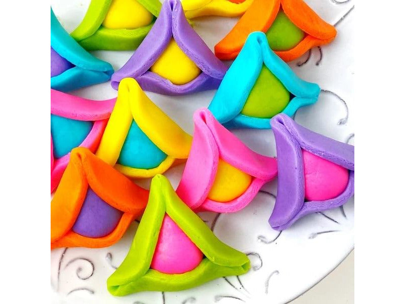 Who doesn’t love a fantasy color palette on a marzipan hamantaschen? shades of aqua, lime, pink. lavender and more!   What better way to have fun with our vegan and gluten-free Purim treats - enjoy!