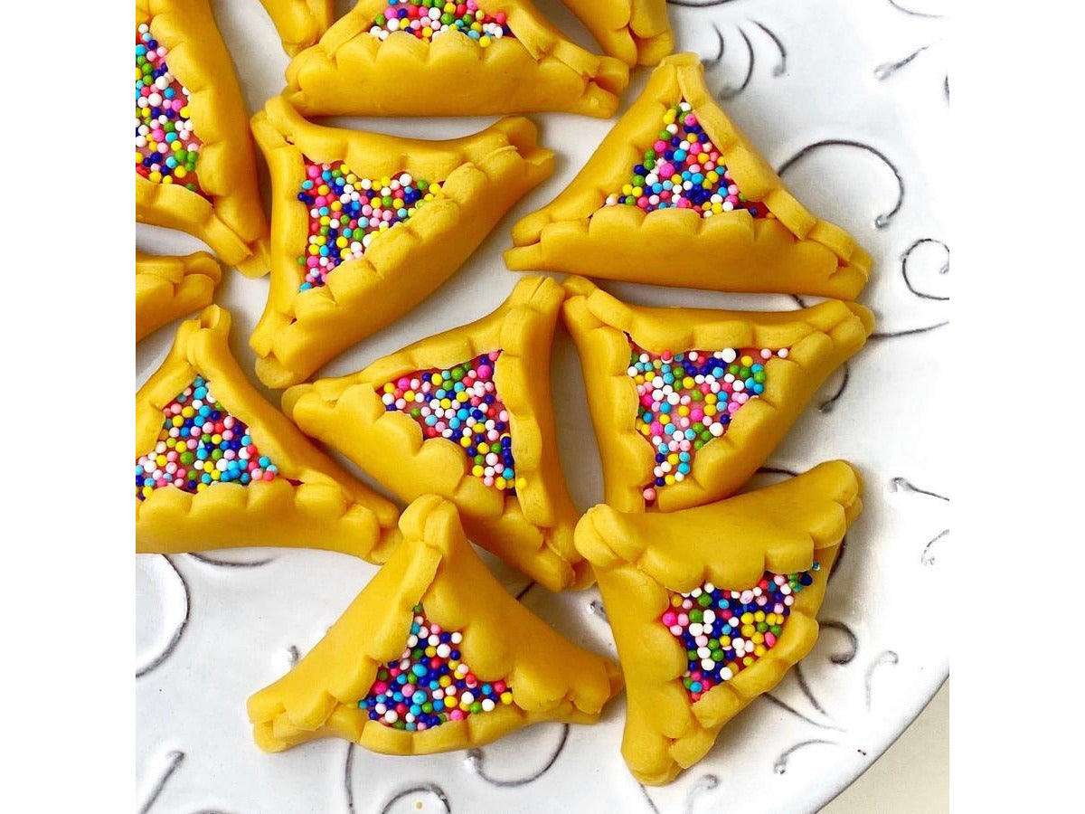 We added a modern twist to our marzipan hamantaschen - sprinkles!   Using a signature mix of sprinkles, these vegan and gluten-free Purim treats are super festive - enjoy!